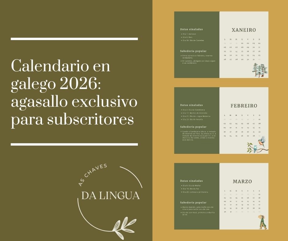 Subscribirte á newsletter d’As chaves da lingua ten premio. Todos os novos e vellos subscritores recibirán de balde un calendario en galego para 2026 coas datas máis