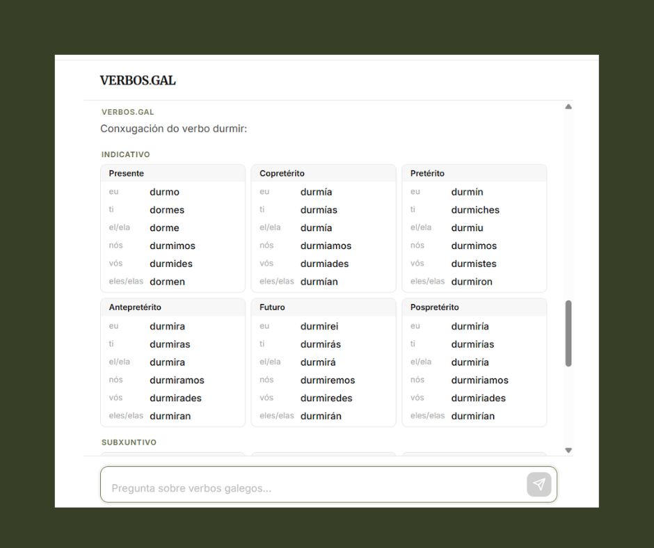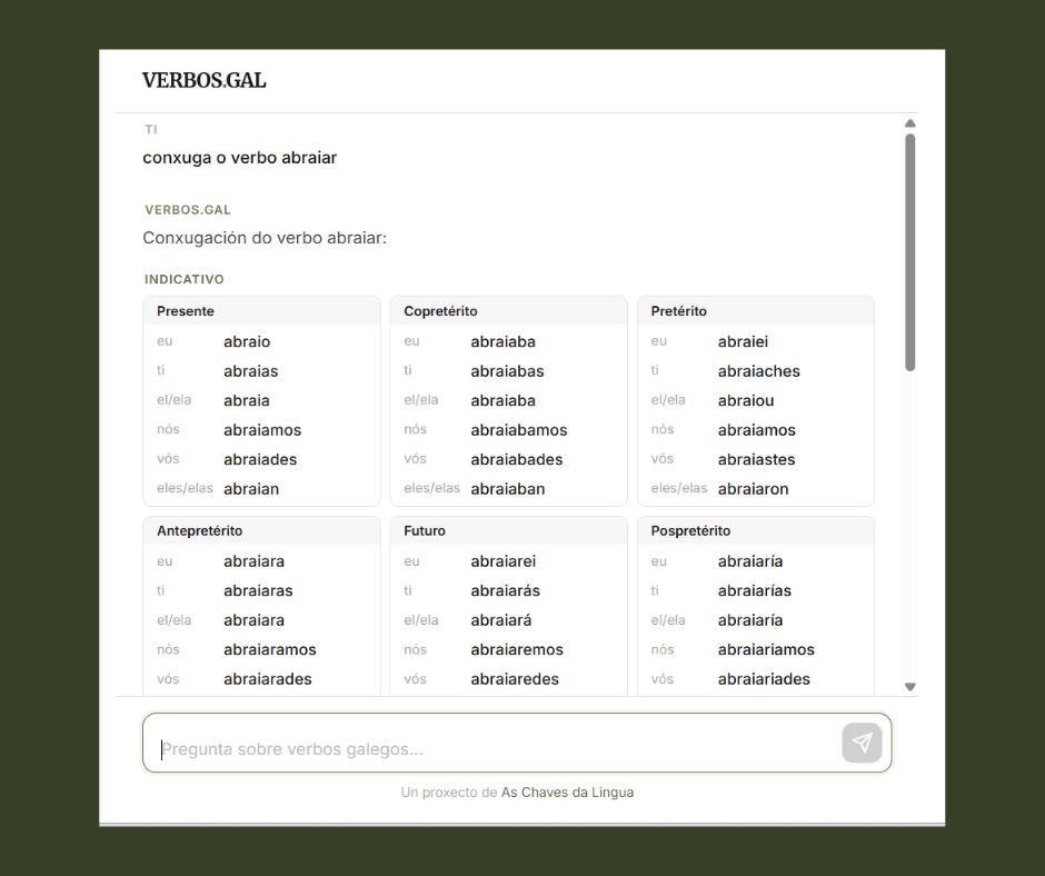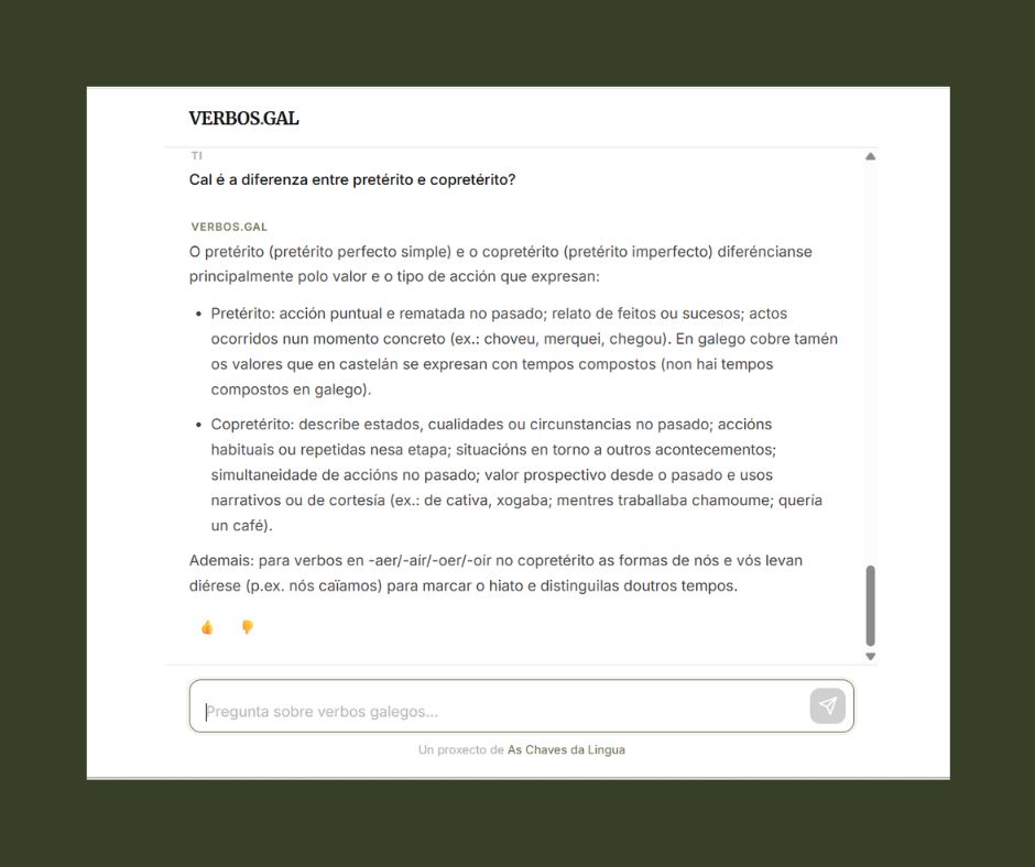 Verbos.gal é un chatbot experimental especializado nos verbos galegos. Isto significa que podes facer preguntas en linguaxe natural, igual que lle preguntarías a unha persoa, e obter unha resposta ao instante.